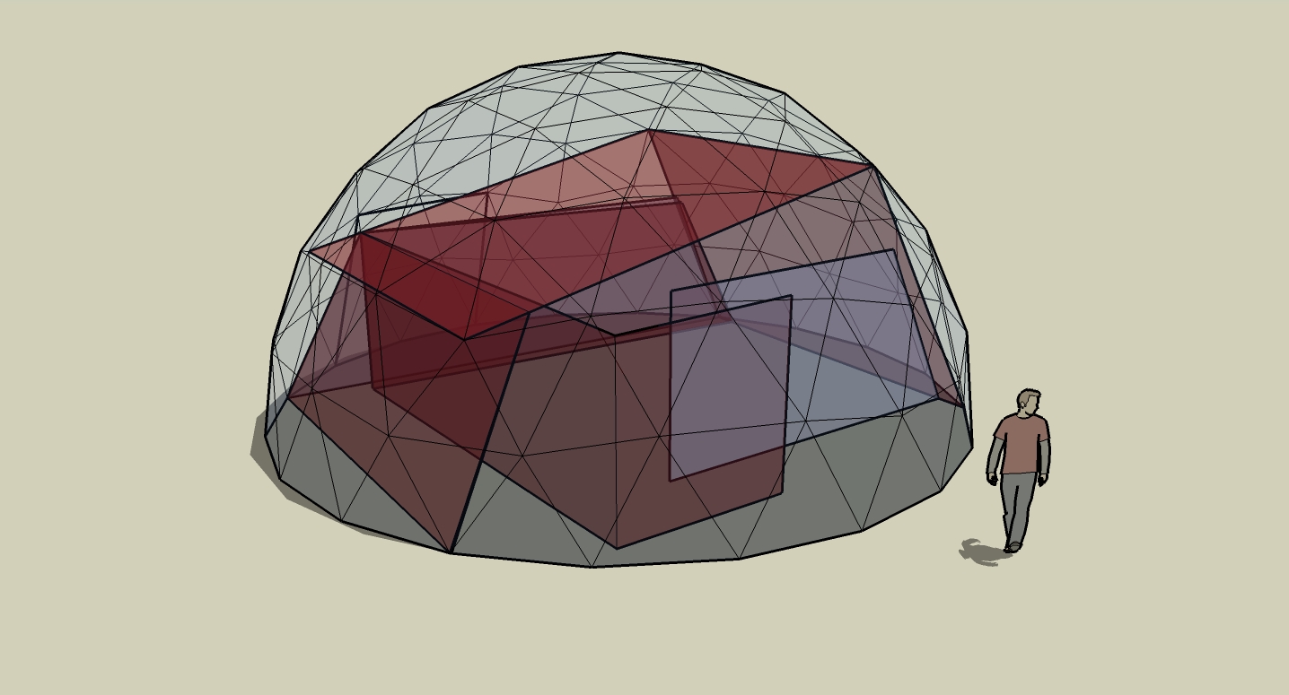 Interior Space In order to make use of the interiors I propose fabric be hung from the vertices. These tarps can provide privacy and interior design accents That are readily relocated on the fly. For large public spaces, in pleasant climates the enclosure of the outside of the dome can be forgone and the hung fabric can be used to shield form the sun and occational showers.