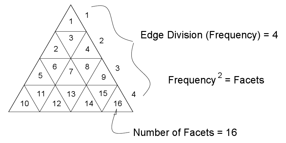 Webster defines Geometry as " a branch of mathematics concerned with the properties, measurements and relationships of points, lines, angles, surfaces, and solids ". Much of geometry was described by the ancient Greek mathematician Euclid. Euclidean Geometry is based upon axioms. An Axiom is a postulate advanced as an essential premise of a train of reason. The following are Euclidean axioms: A point is a geometric element (a place in space) being determined by a single ordered set of coordinates. A line is a geometric element that is generated by a moving point and has extension only along the path of the point. A straight line is generated by a point moving continuously in the same direction and is expressed by a linear equation . A locus is the set of all points determined by stated conditions. A plane is locus of such nature that a straight line joining any 2 of its points lies wholly in said locus. A polygon is a closed planar figure bound by straight lines or great circle arcs. These Axioms provide us with definitions and a basis for discussion. Fuller's approach to geometry was experimental, thus scientific. He looked to nature and asked what are basic natural laws associated with geometry and structure. One of Fuller's early mathematical discoveries was the fact that triangles - regular, isosceles and scalene- may be modularly subdivided to express second-powering. Triangles are the basic polygons - i.e. all polygons are reducible to triangles and are further irreducible. The fundamental principle of finite local system mathematics is that the the universe is divided into 2 main parts, the withinness and the withoutness. The triangle is the simplest divisor of space into withiness and withoutness using straight lines. Any triangle whose 3 edges are each evenly divided into the same number of intervals, and whose edge-interval marks are cross-connected with lines that are inherently parallel to the triangle's respective 3 outer edges - will be subdivided by little triangles all exactly similar to the big triangle thus subdivided, and the number of small similar triangles subdividing the large master triangle will always be the Second Power of the number of edge modules of the big triangle.In other words, we can say "triangling" instead of "squaring" and since all squares are subdividable into 2 triangles and since each of these triangles can demonstrate a real second-powering, and since nature is always most economical and since nature requires structural integrity of her forms of reference, she must be using "triangling" instead of "squaring" when any integer is multiplied by itself. Another non-Ionian Greek, Pythagoras, demonstrated and "proved" that the number of square areas of the unit-module-edged squares and the number of cubical module volumes of the module-edged-cubes correspond exactly with arithmetic's second-powerings and third-powerings. The Greeks and all mathematicians and scientists, have ever since assumed these square and cube results are the only possible products of such successive inter-multiplying of geometry's unit-edge-length modular components. SOLIDS