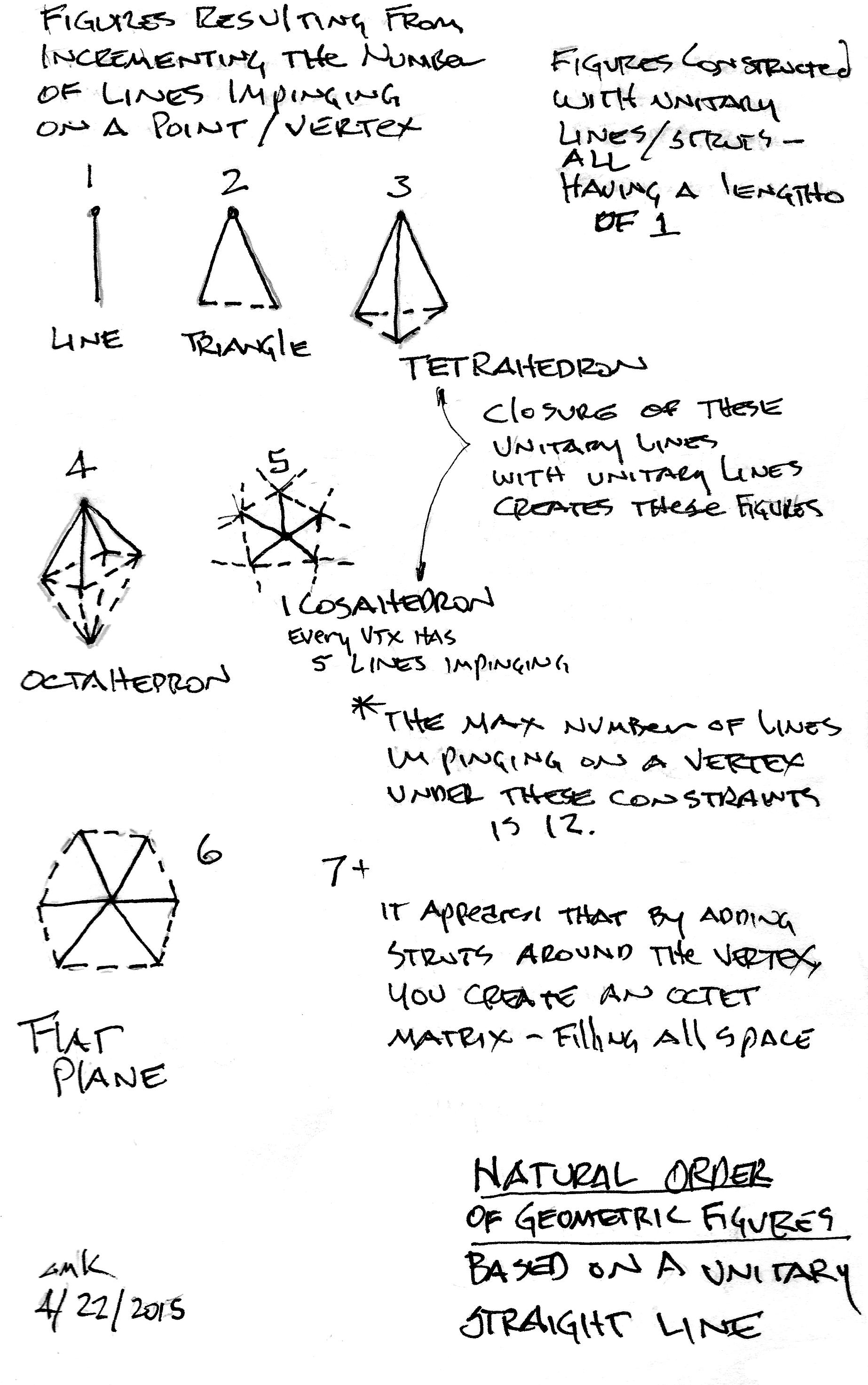 There is a Natural Order of Geometric Figures that results from the intersection of Unitary Lines. Unitary Lines are lines being 1 unit in length. If we progress from 1 onward in increments of 1 for the number of lines impenging on a point and if we connect each of these lines other ends with unitary lines we find that a Natural Order of Geometric Figures result.![]()