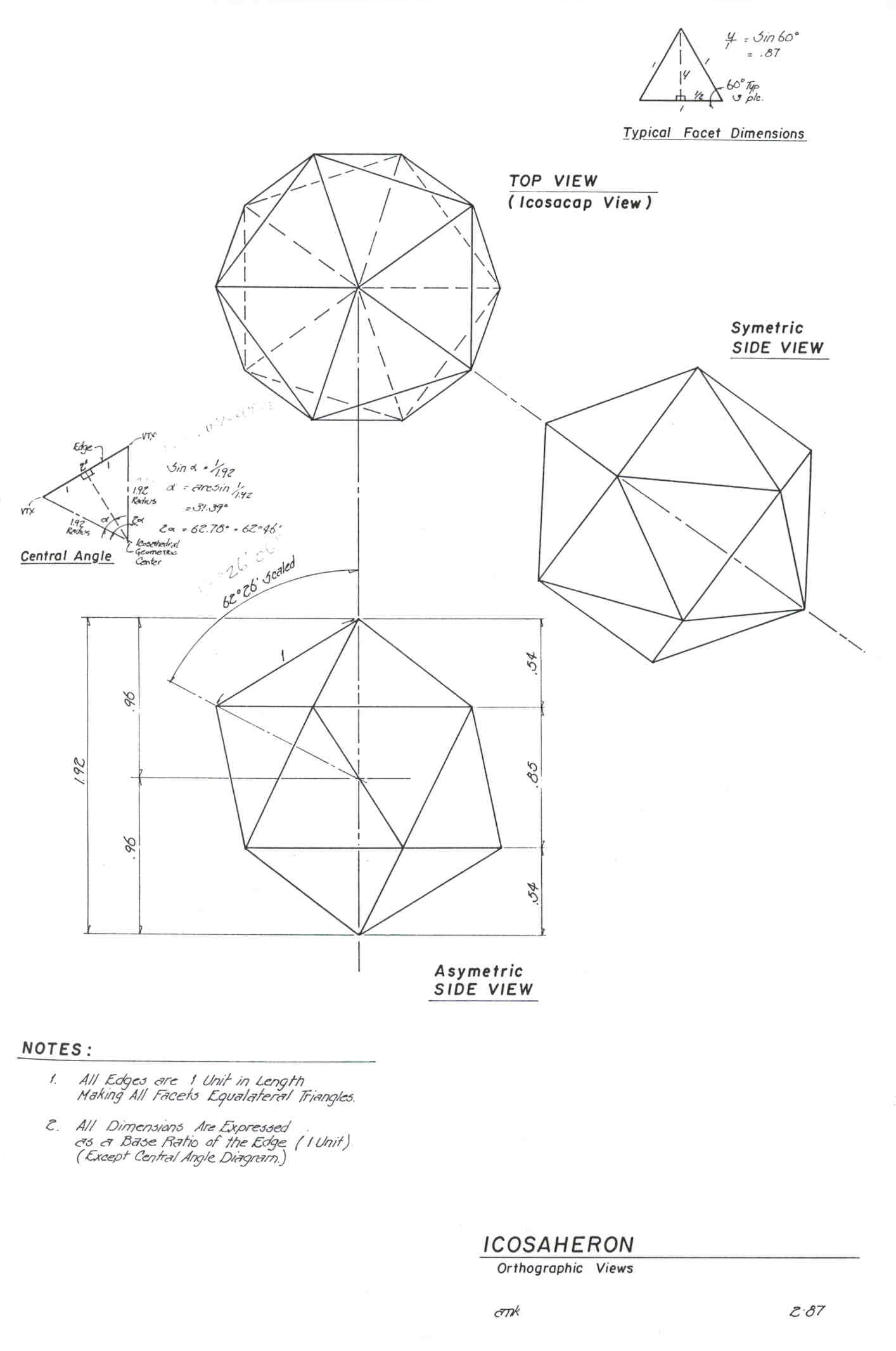 An icosahedron is a polyhedron of 20 faces. A spherical icosahedron is an icosahedron 'exploded' onto the surface of a sphere ; it bears the same relation to an icosahedron as a spherical triangle to a plane triangle - the edges of the faces of the spherical icosahedron are all geodesic lines. The icosahedron is the least strong prime structural system but encloses the greatest volume per unit of invested energy. See the appendix for models of the 3 basic solids.![]()