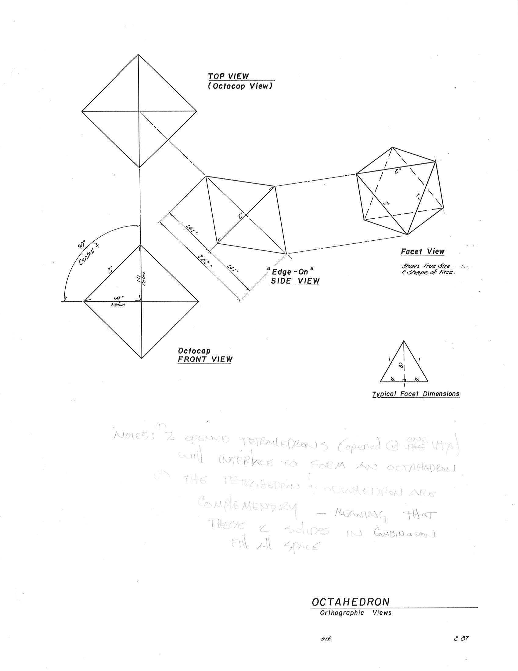 The regular octahedron is an 8 sided triangular faceted polyhedra. The Octahedron is the complement of the Tetrahedron to fill all space. It automatically is formed when Tetrahedrons are joined corner to corner on a plane. The octahedron is the prefered system for a balance of strength and volume. An octahedron consists of 12 vector edges and 2 units of quantum and has a volume of 4 when the tetrahedron is taken as unity. The octahedron represents the most commonly occurring crystallographic conformation in nature. It is the most typical association of energy as matter, it is at the heart of such association. Any focus in the gravitational pull of the rest of the universe upon the octahedrons symmetry precesses it into asymmetrical deformation in a plane at 90 degrees to the axis of exaggerated pulling. This forces one of the 12 edge vectors of the octahedron to rotate at 90 degrees. If we think of the octahedron's 3 XYZ axes and its 6 vertexes, oriented in such a manner that X is the north pole an X' is the south pole, the other 4 vertexes - Y,Z,Y', Z'- all occur in the plane of, and define, the octahedrons equator. The effect of gravitational pull upon the octahedron will make one of the 4 equatorial vectors disengage from its 2 adjacent equatorial vertices, thereafter to rotate 90 degrees and then rejoin its 2 ends with the north and south pole vertices. When this precessional transformation is complete, we have the same topological inventories of 6 vertexes, 8 exterior triangle faces, and 12 vector edges as we had before in the symmetrical octahedron, but in the process the symmetrical, 4-tetrahedra-quanta-volumn octahedron has been transformed into 3 tetrahedra (3-quanta volume) arranged in an arc section of an electromagnetic wave conformation with each of the 2 end tetrahedra being faced bonded to the center tetrahedron.