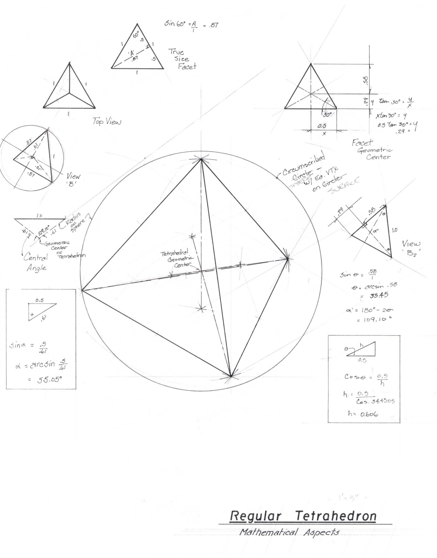 The Tetrahedron is the basic structural system. All other structure is a transformative phase or complex of tetrahedronal transformations. The tetrahedron (4 faceted structure) is the minimum-prime divisor of omnidirectional universe into 2 fundamental domains - the withinness & withoutness, the included & excluded, the microcosm & macrocosm. All polyhedra maybe subdivided into component tetrahedra; no tetrahedron maybe subdivided into component polyhedra of less than 4 faces. The regular 6 chord edge tetrahedron encloses (defines) the minimum volume with the most surface area of all geometric polyhedra (structural systems). Of the three prime structural systems of universe, the tetrahedron is the strongest per unit volume enclosed. When stressed with a high relative internal pressure, all polyhedra tend to define the maximum volume with minimum surface; toward the spherical convex-arc edged tetrahedra. When stressed with a high relative external pressure, structures tend to enclose minimum volume with maximum surface - the chordal or concave tetrahedron being the 4 webbed interaction between the 6 exterior edges of the tetrahedron & its center of gravity). The regular tetrahedron is the zero phase between the convex tetrahedron & concave tetrahedron. Chordal-edged tetrahedronal structures best resist external forces & their vertices best resist concentrated loads. Arc-edged tetrahedra best resist internal pressures & their surface arc vertices best resist concentrated internal pressure & impact forces. Both chordal edged tetrahedra & arc-edged tetrahedra permit omnidirectionally valved penetrations. Any non-equi-edged quadrangle with each of its 4 edges uniformly subdivided into the same number of intervals and with those interval marks interconnected, produces a pattern of dissimilar quadrangles. In the same manner, all tetrahedra, octahedra, cubes and rhombic dodecahedra-regular or skew- can be unitarily subdivided into tetrahedra with the cube consisting of 3 tetra, the octahedron of 4 tetra, and the rhombic dodecahedron of 6 similar tetra; and that when any of these regular or skew polyhedras' similar or dissimilar edges and faces are uniformly subdivided and interconnected, their volumes would always be uniformly subdivided into regular or skew tetrahedra, and that N^3 can and should be written N^tetrahedroned and not as N^squared. Nature would use the tetrahedron as the module of subdivision because nature has proven, to the physicists and the other physical scientists, that she always chooses the most economic realization. Cubes require 3 times as much Universe as do tetrahedra to demonstrate volumetric content of systems because cubic identification with third-powering used up three times as much volume as is available in Universe. As a result of cubic mensuration science has had to invent such devices as "probability" and "imaginary numbers". Thus "squaring" and "cubing" instead of nature's "triangling" and "tetrahedroning", account for science's using mathematical tools that have no physical-model demonstrability- ergo, are inherently "unscientific". If the Greeks had tried to do so, they would soon have discovered that they could not join tetrahedra face-to-face to fill all-space; whereas they could join cubes face-to-face to fill all-space. Like all humans they were innately intent upon finding the "Building-Block" of Universe. The cube seemed to the Greeks, the Mesopotamians, and the Egyptians to be just what they needed to account their experiences volumetrically. But if they had tried to do so, they would have found that unit-dimensioned tetrahedra could be joined corner-to-corner only within the most compact omnidirectional confine permitted by the corner-to-corner rule, which would have disclosed the constant interspace form of the octahedron which complements the tetrahedron to fill all-space; had they done so, the Ionians would have anticipated the physicists' 1922 discovery of "Fundamental Complementarity" as well as the 1956 Nobel-winning physics discovery that the complementarity does not consist of the mirror image of that which it complements. But the Greeks did not do so, and they tied up humanity's accounting with the cube which now, 2,000 years later, has humanity in a lethal bind of 99% scientific illiteracy.